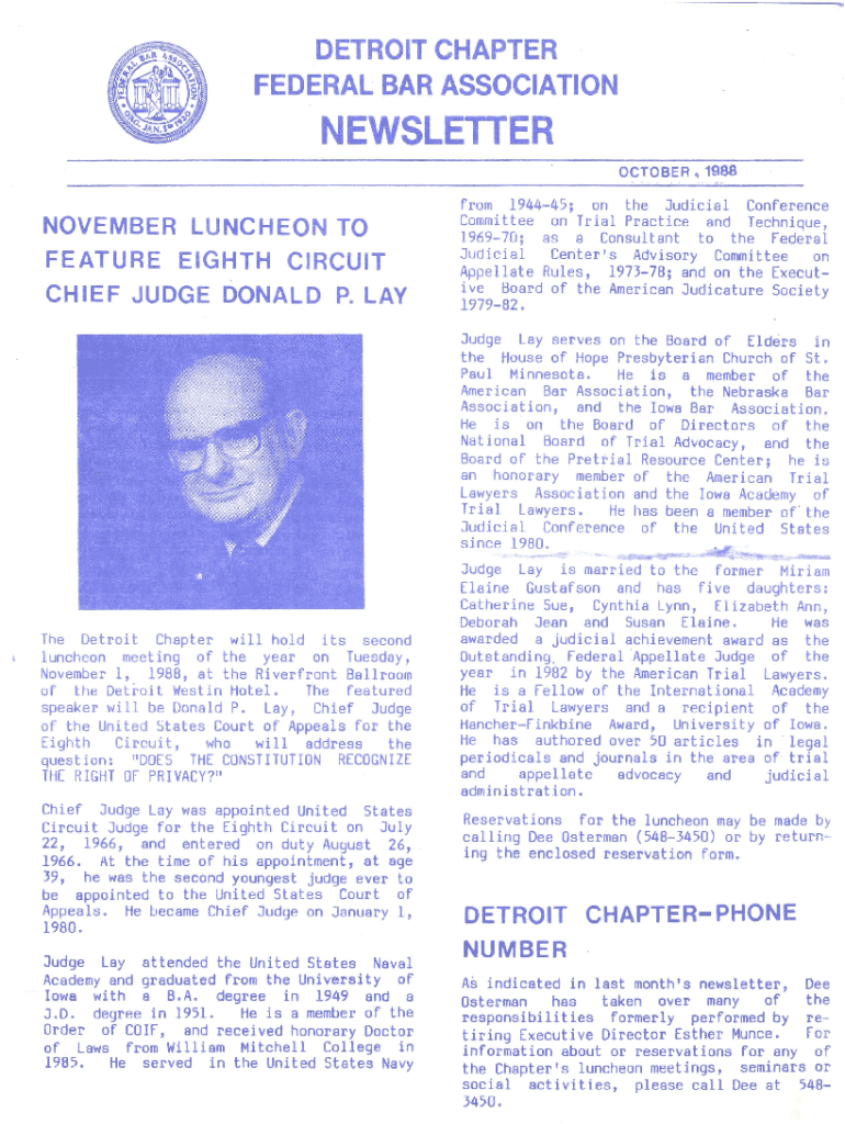 DETROIT CHAPTERFEDERAL BAR ASSOCIATIONNEWSLETTER OCTOBER. 1988NOVEMBER LUNCHEON TO FEATURE EIGHTH CIRCUIT CHIEF JUDGE DONALD P. LAY from 194445; on the Judicial Conference Committee on Trial Practice