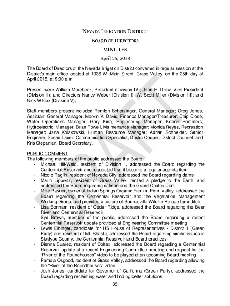 NEVADA IRRIGATION DISTRICT BOARD OF DIRECTORS MINUTES April 25, 2018, The Board of Directors of the Nevada Irrigation District convened in regular session at the District\'s main office located at