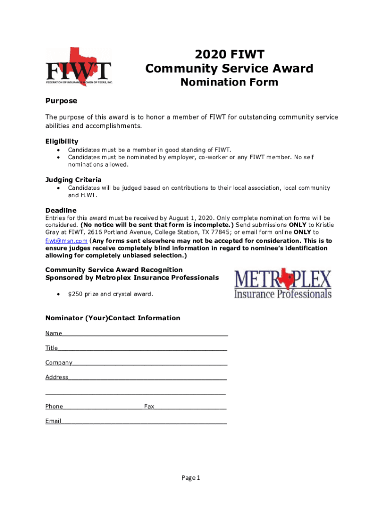 2020 FIT Community Service Award Nomination Form Purpose The purpose of this award is to honor a member of FIT for outstanding community service abilities and accomplishments. Eligibility Candidates
