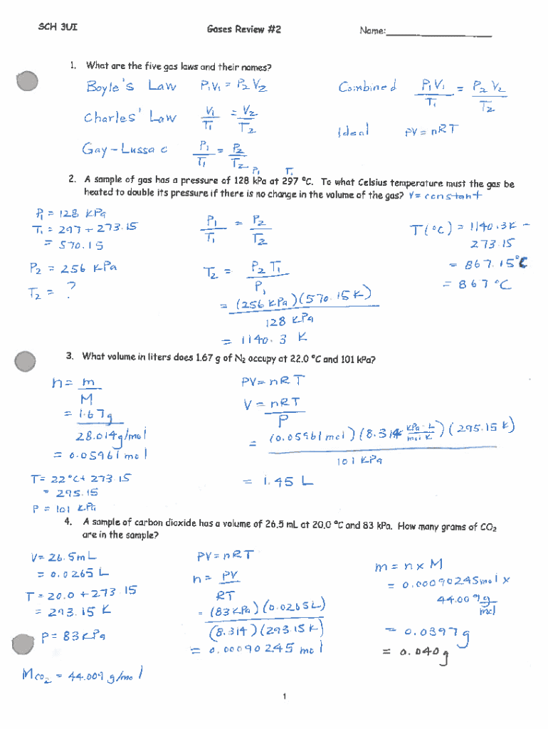 ___5tH 3U1&oses Review #21. Name:. What are the five gas lows and their names? CcrnbnciP1V1Low Gay-Lussac. 17pyplZTZL 12. A sample of gas has a pressure of 128 PA at 297 C. To what Celsius temperature