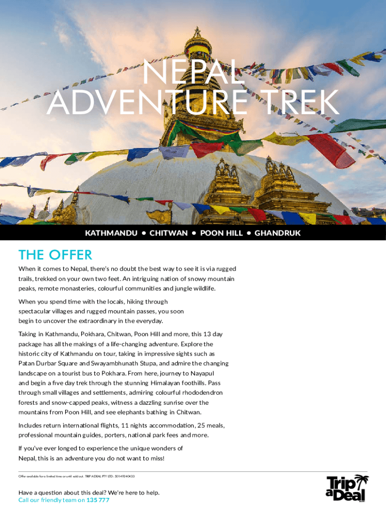 NEPAL ADVENTURE TREKKATHMANDU CHILEAN POOR HILL GHANDRUKTHE OFFER When it comes to Nepal, there's no doubt the best way to see it is via rugged trails, trekked on your own two feet. An intriguing