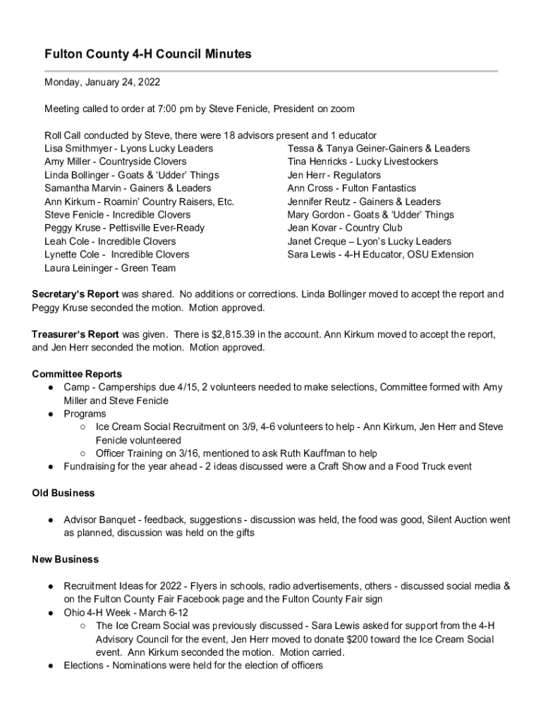 Fulton County 4H Council Minutes Monday, January 24, 2022, Meeting called to order at 7:00 pm by Steve Vehicle, President on Zoom Roll Call conducted by Steve, there were 18 advisors present and 1