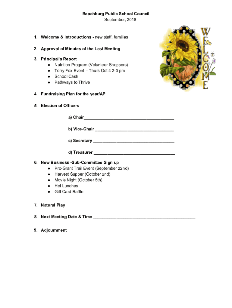 Beach burg Public School Council September 2018 1. Welcome & Introductions new staff, families 2. Approval of Minutes of the Last Meeting 3. Principals Report Nutrition Program (Volunteer Shoppers)