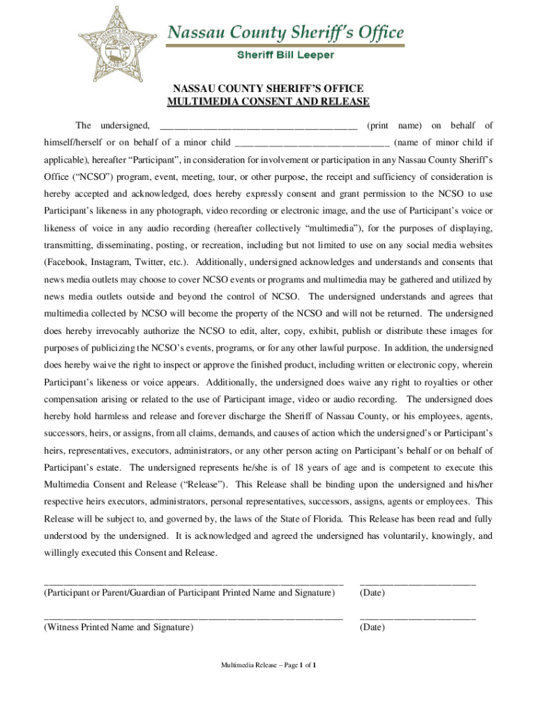NASSAU COUNTY SHERIFFS OFFICE MULTIMEDIA CONSENT AND RELEASE The undersigned, ___ (print name) on behalf of himself/herself or on behalf of a minor child ___ (name of minor child if applicable), hereafter