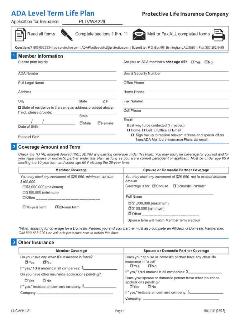 Read all formsProtective Life Insurance CompanyPLLVWS22ILComplete sections 1 through 11Mail or Fax ALL completed formsQuestions? 866.607.5334 | Ada.protective.com