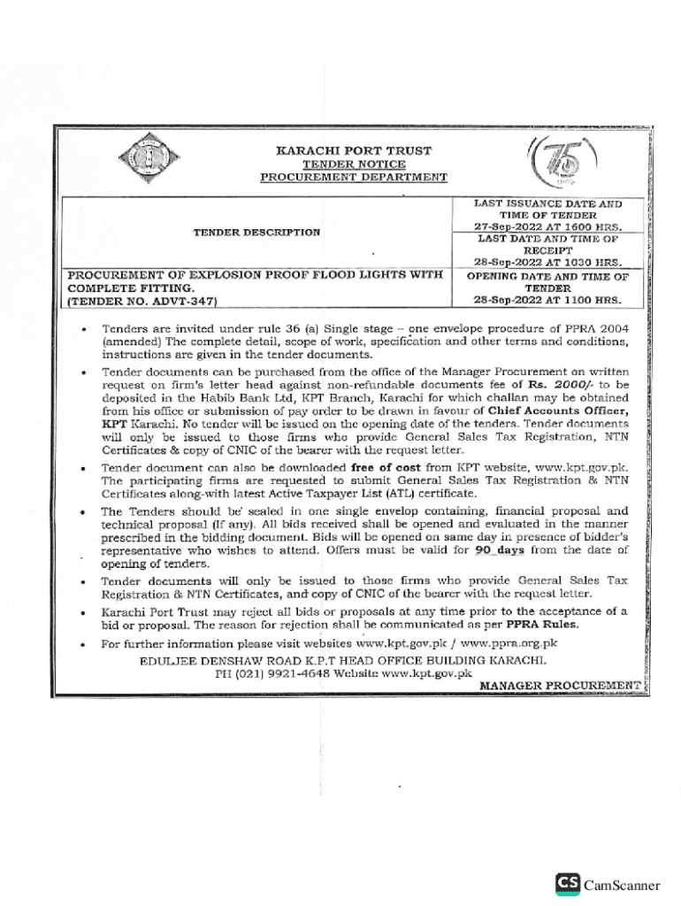 CamScannerTender No. ADVT 351 TENDER FOR THE PROCUREMENT OF EXPLOSION PROOF Floodlights WITH COMPLETE FITTING Contents: (1)Tender Notice(2)Instruction to Tenderer(3)The Tender(4)Standard Conditions
