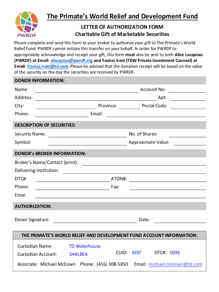 The Primates World Relief and Development Fund LETTER OF AUTHORIZATION FORM Charitable Gift of Marketable Securities Please complete and send this form to your broker to authorize your gift to The