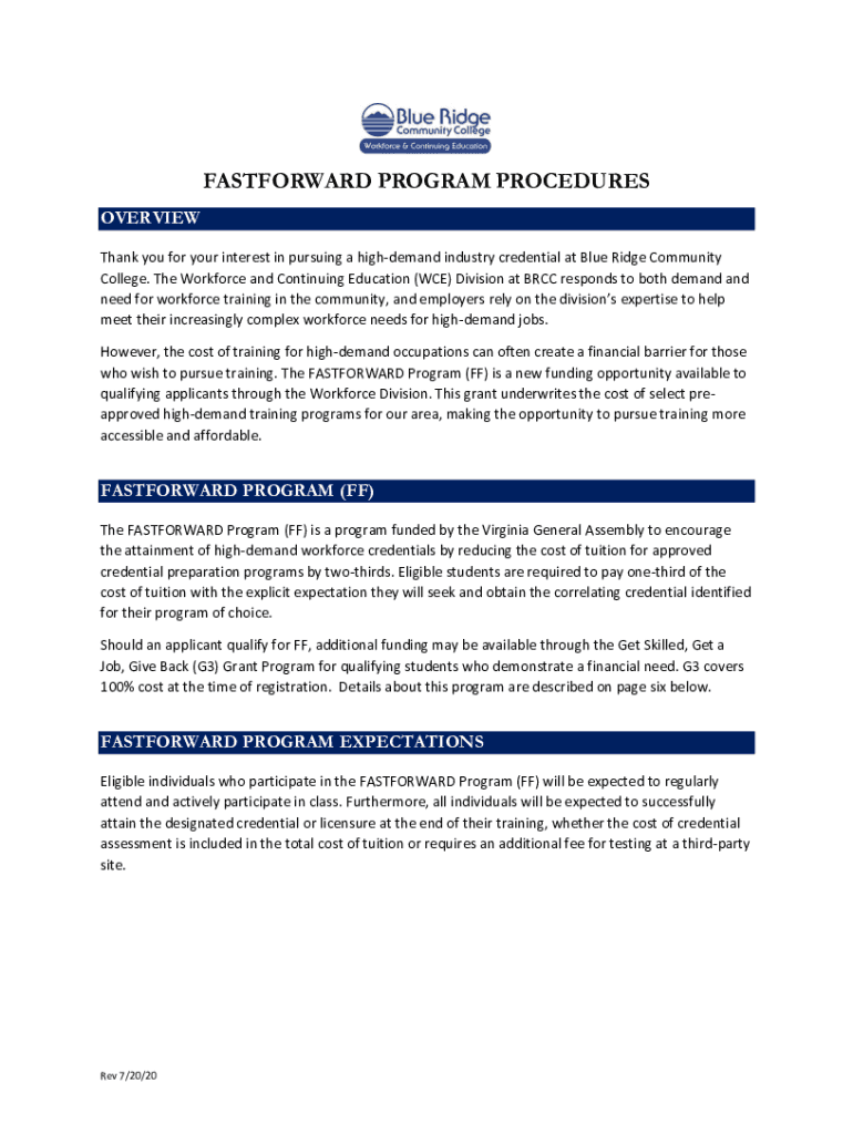 FEEDFORWARD PROGRAM PROCEDURES OVERVIEW Thank you for your interest in pursuing a high demand industry credential at Blue Ridge Community College. The Workforce and Continuing Education (WE) Division