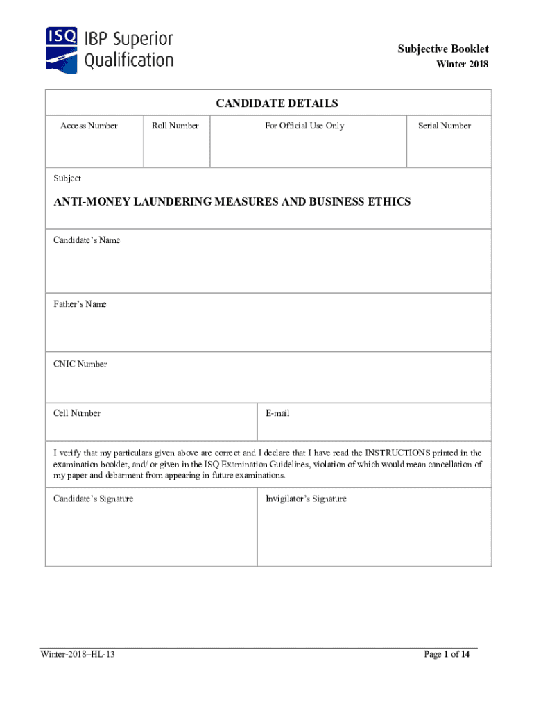 Access NumberRoll Number Official Use OnlySerial NumberSubjectANTIMONEY LAUNDERING MEASURES AND BUSINESS ETHICS