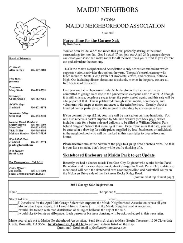 MAID NEIGHBORS RCONAMAIDU NEIGHBORHOOD ASSOCIATION April 2021Purge Time for the Garage Sale By David SteeleYouve been an inside WAY too much this year, probably staring at the same surroundings for