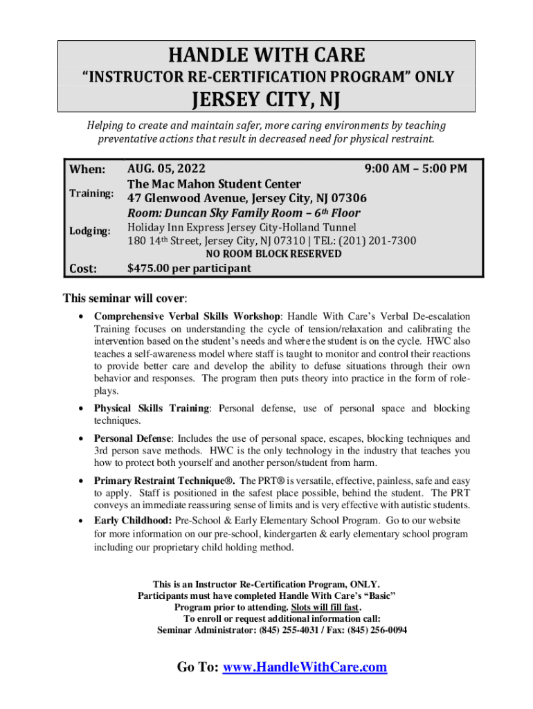 HANDLE WITH CARE INSTRUCTOR RECERTIFICATION PROGRAM ONLYJERSEY CITY, Helping to create and maintain safer, more caring environments by teaching preventative actions that result in decreased need for