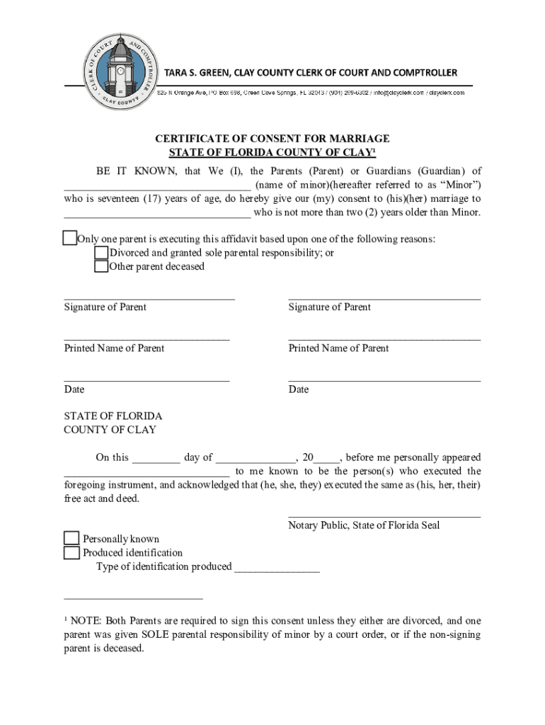 CERTIFICATE OF CONSENT FOR MARRIAGE STATE OF FLORIDA COUNTY OF CLAY BE IT KNOWN, that We (I), the Parents (Parent) or Guardians (Guardian) of ___ (name of minor)(hereafter referred to as Minor) who