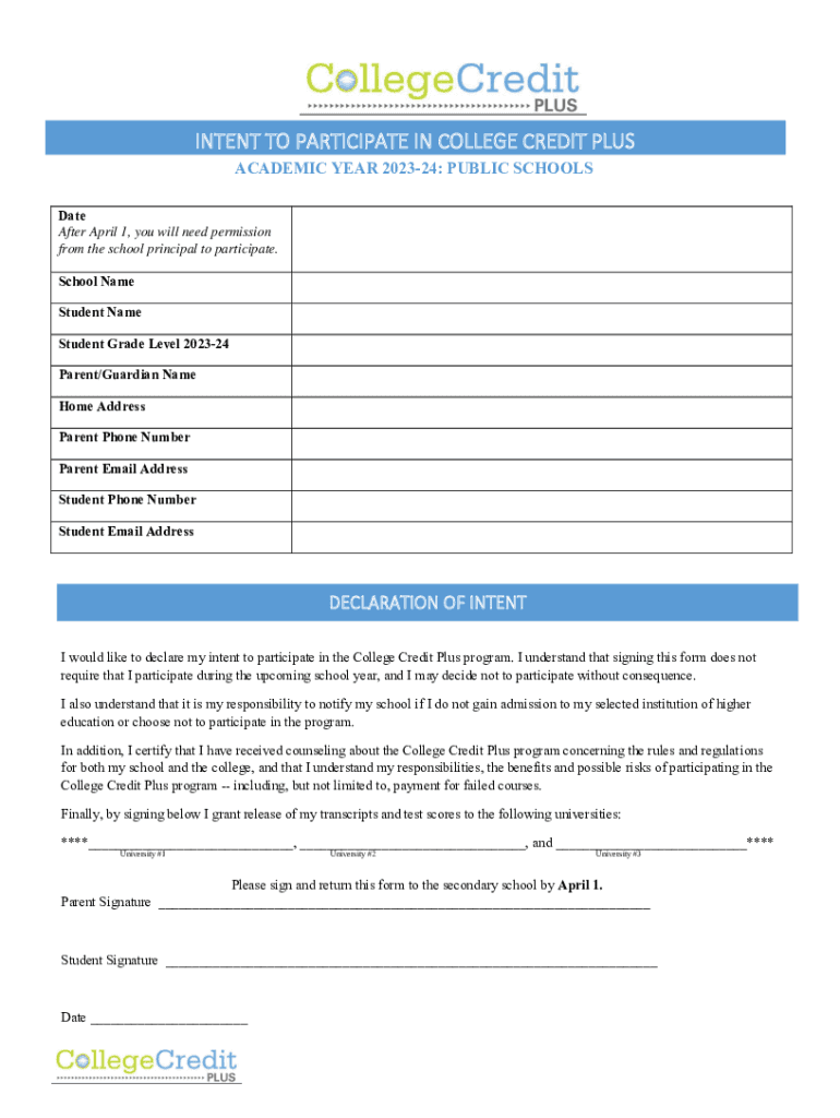 INTENT TO PARTICIPATE IN COLLEGE CREDIT PLUS ACADEMIC YEAR 202324: PUBLIC SCHOOLS Date After April 1, you will need permission from the school principal to participate. School Name Student Grade Level