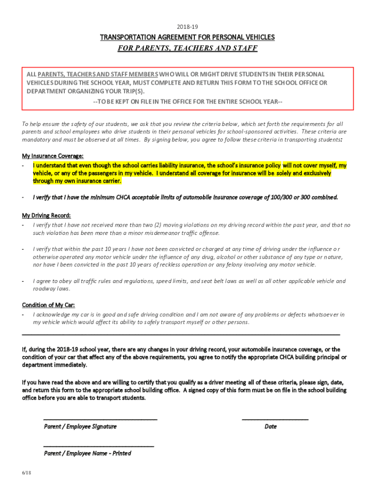 201819TRANSPORTATION AGREEMENT FOR PERSONAL VEHICLES FOR PARENTS, TEACHERS AND STAFF ALL PARENTS, TEACHERS AND STAFF MEMBERS WHO WILL OR MIGHT DRIVE STUDENTS IN THEIR PERSONAL VEHICLES DURING THE