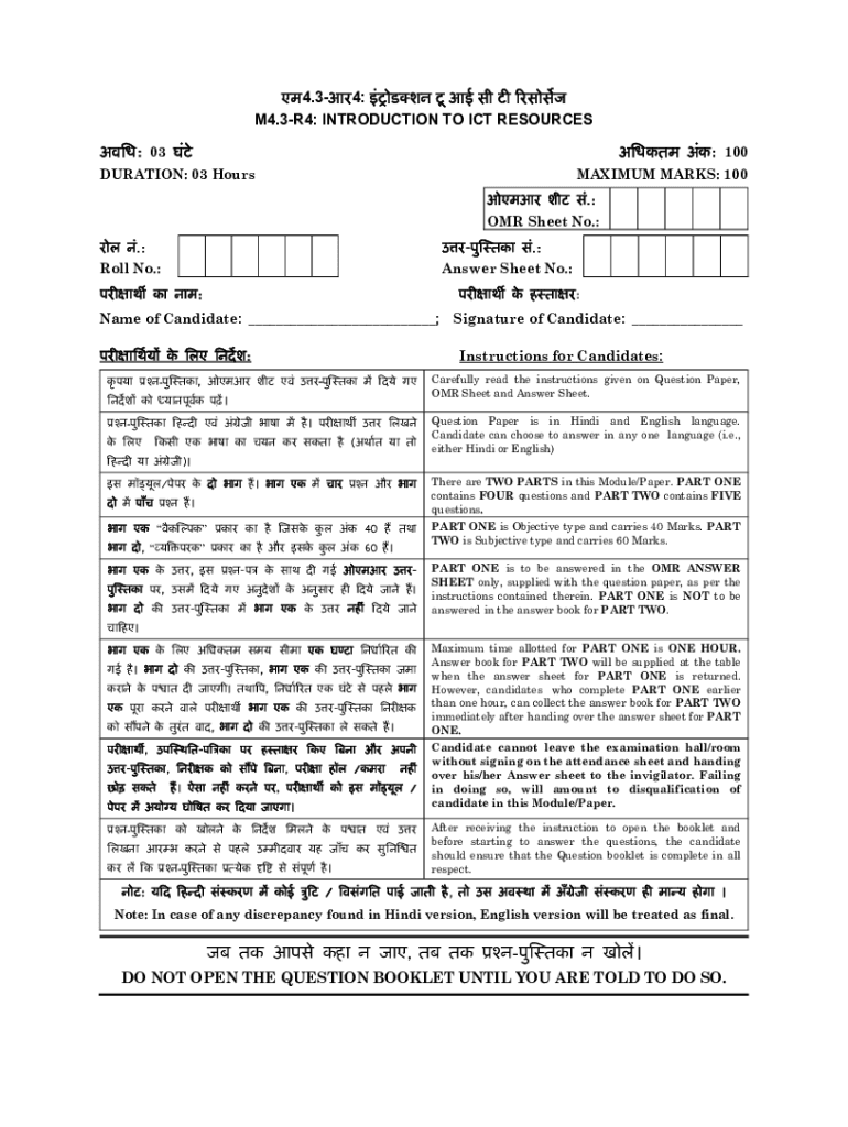 4.34: M4.3R4: INTRODUCTION TO ICT RESOURCES : 03 : 100DURATION: 03 HoursMAXIMUM MARKS: 100.: OMR Sheet No.:.: Roll No.:.: Answer Sheet No.: :Name of Candidate: ___; :