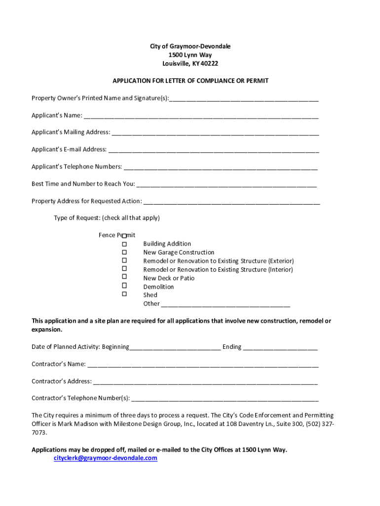 City of GraymoorDevondale 1500 Lynn Way Louisville, KY 40222 APPLICATION FOR LETTER OF COMPLIANCE OR PERMIT Property Owners Printed Name and Signature(s):___ Applicants Name: ___ Applicants Mailing