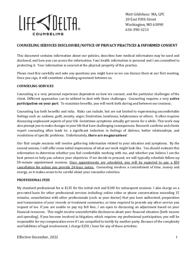 Matt GildehausMA, LPC20 East Fifth Street Washington, MO 630906363903213COUNSELING SERVICES DISCLOSURE/NOTICE OF PRIVACY PRACTICES & INFORMED Consents document contains information about our policies,