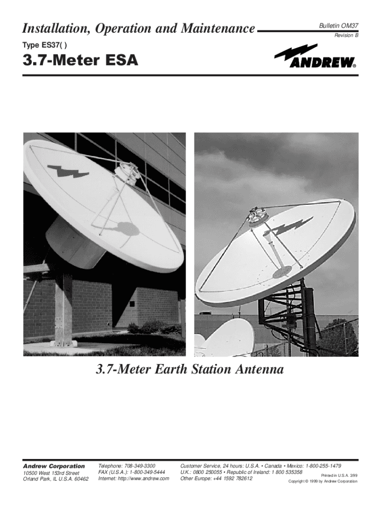 Installation, Operation and MaintenanceBulletin OM37 Revision Type ES37()3.7Meter ESA3.7Meter Earth Station Antenna Andrew Corporation 10500 West 153rd Street Orland Park, IL U.S.A. 60462Telephone:
