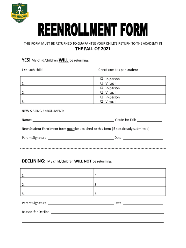 THIS FORM MUST BE RETURNED TO GUARANTEE YOUR CHILD RETURN TO THE ACADEMY THE FALL OF 2021 YES! My child/children WILL be returning: List each childCheck one box per student. 1. 2. 3. Unperson Virtual