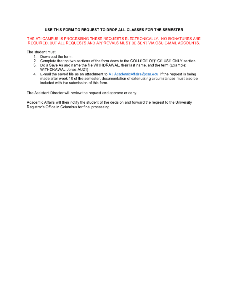 USE THIS FORM TO REQUEST TO DROP ALL CLASSES FOR THE SEMESTER THE ATI CAMPUS IS PROCESSING THESE REQUESTS ELECTRONICALLY. NO SIGNATURES ARE REQUIRED, BUT ALL REQUESTS AND APPROVALS MUST BE SENT VIA