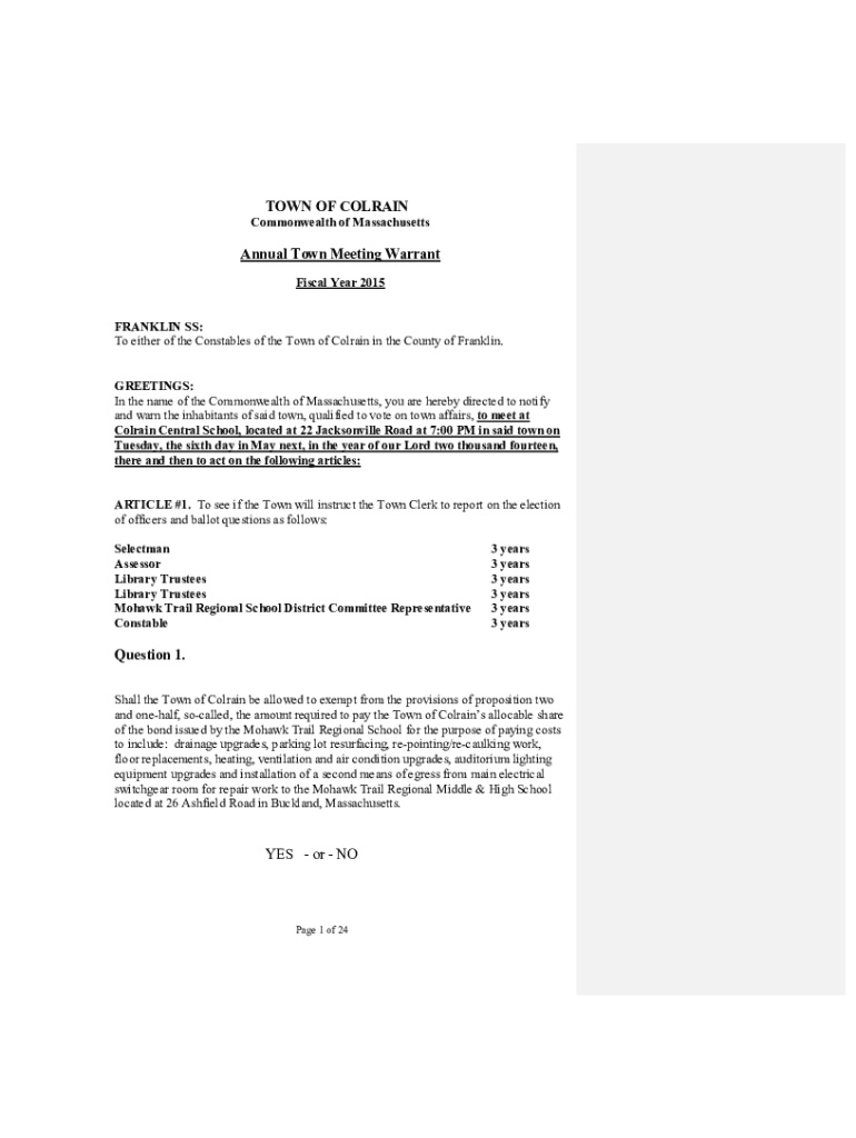 TOWN OF CONTAIN Commonwealth of MassachusettsAnnual Town Meeting Warrant Fiscal Year 2015FRANKLIN SS: To either of the Constables of the Town of Col rain in the County of Franklin.GREETINGS: In the