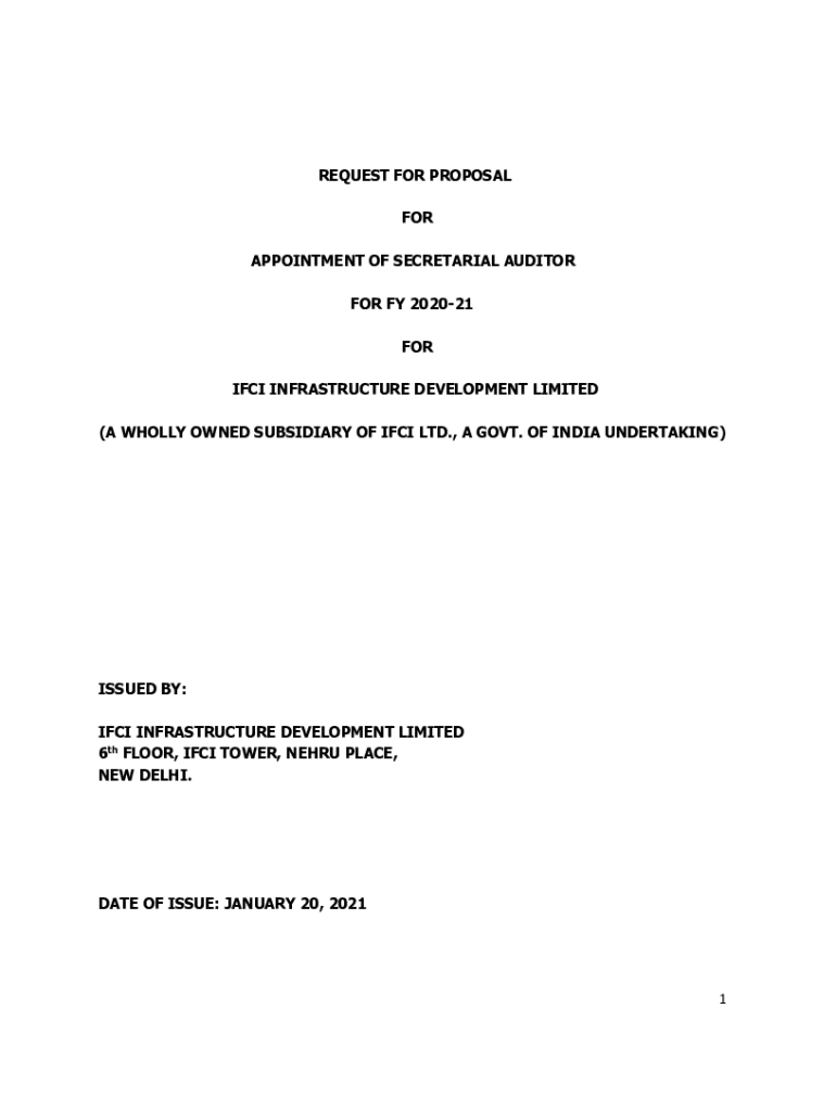 REQUEST FOR PROPOSAL FOR APPOINTMENT OF SECRETARIAL AUDITOR FOR FY 202021 FOR IFC INFRASTRUCTURE DEVELOPMENT LIMITED (A WHOLLY OWNED SUBSIDIARY OF IFC LTD., A GOVT. OF INDIA UNDERTAKING)ISSUED BY: