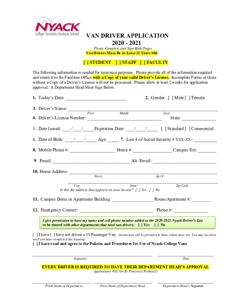 Van Drivers Must Be At Least 21 Years Old[ ] STUDENT[ ] STAFF [ ] Faculty following information