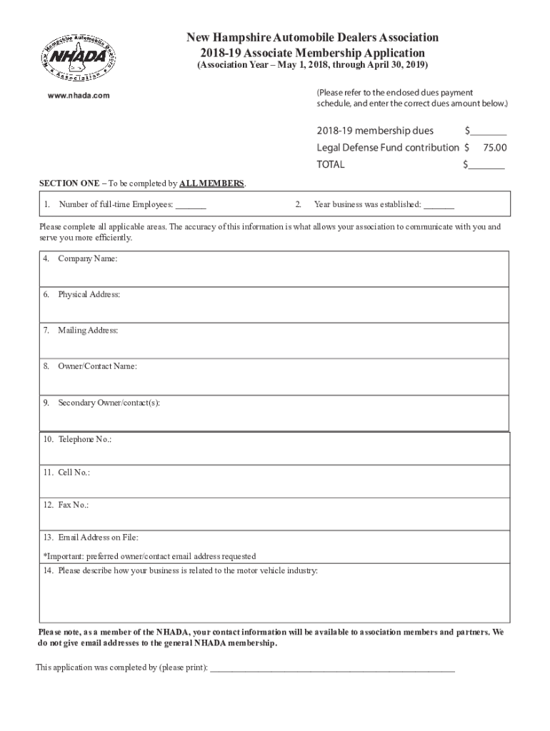 New Hampshire Automobile Dealers Association 201819 Associate Membership Application (Association Year May 1, 2018, through April 30, 2019)(Please refer to the enclosed dues' payment schedule, and