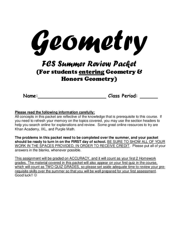 Geometry FCS Summer Review Packet(For students entering Geometry & Honors Geometry) Name:___ Class Period: ___ Please read the following information carefully: All concepts in this packet are reflective