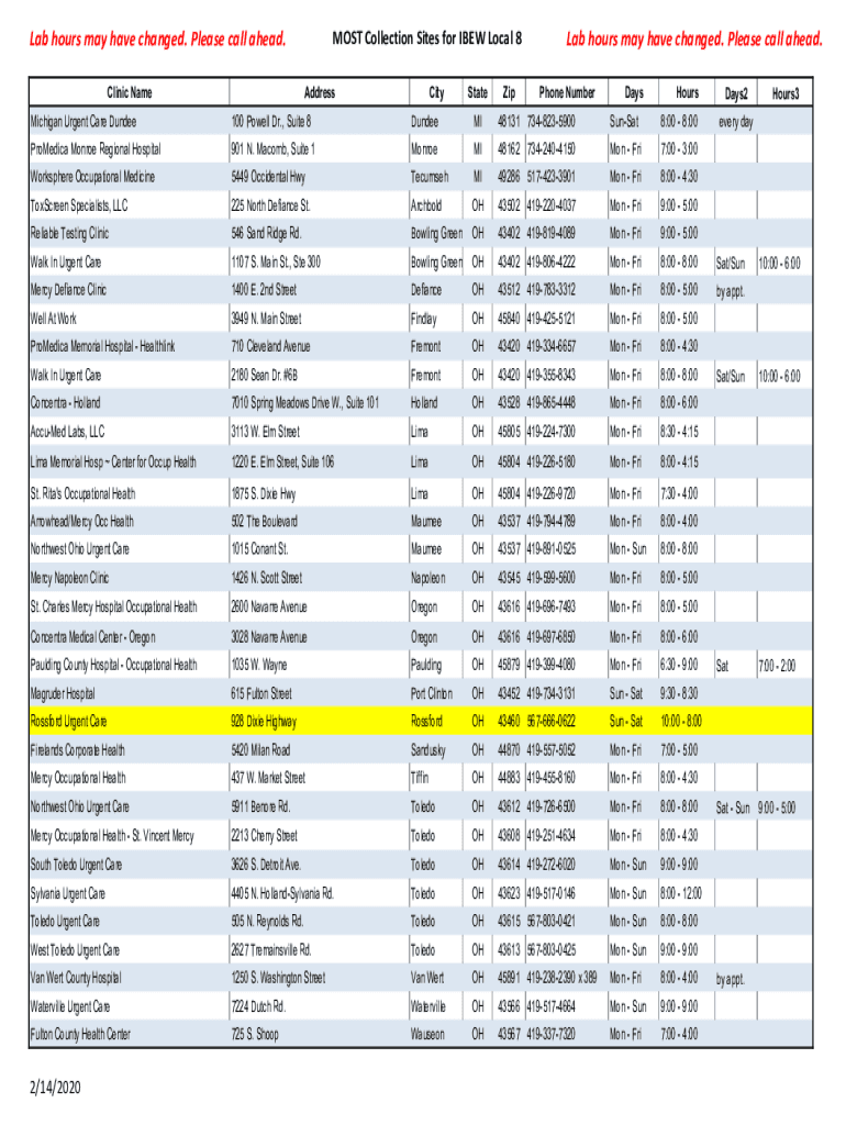 MOST Collection Sites for IBEX Local 8Lab hours may have changed. Please call ahead. Clinic NameAddressCityStateZipLab hours may have changed. Please call ahead. Phone NumberDaysHoursDays2Michigan