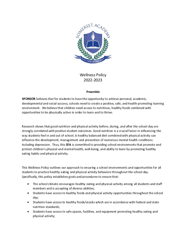 Wellness Policy 20222023 Preamble SPONSOR believes that for students to have the opportunity to achieve personal, academic, developmental and social success, schools need to create a positive, safe,