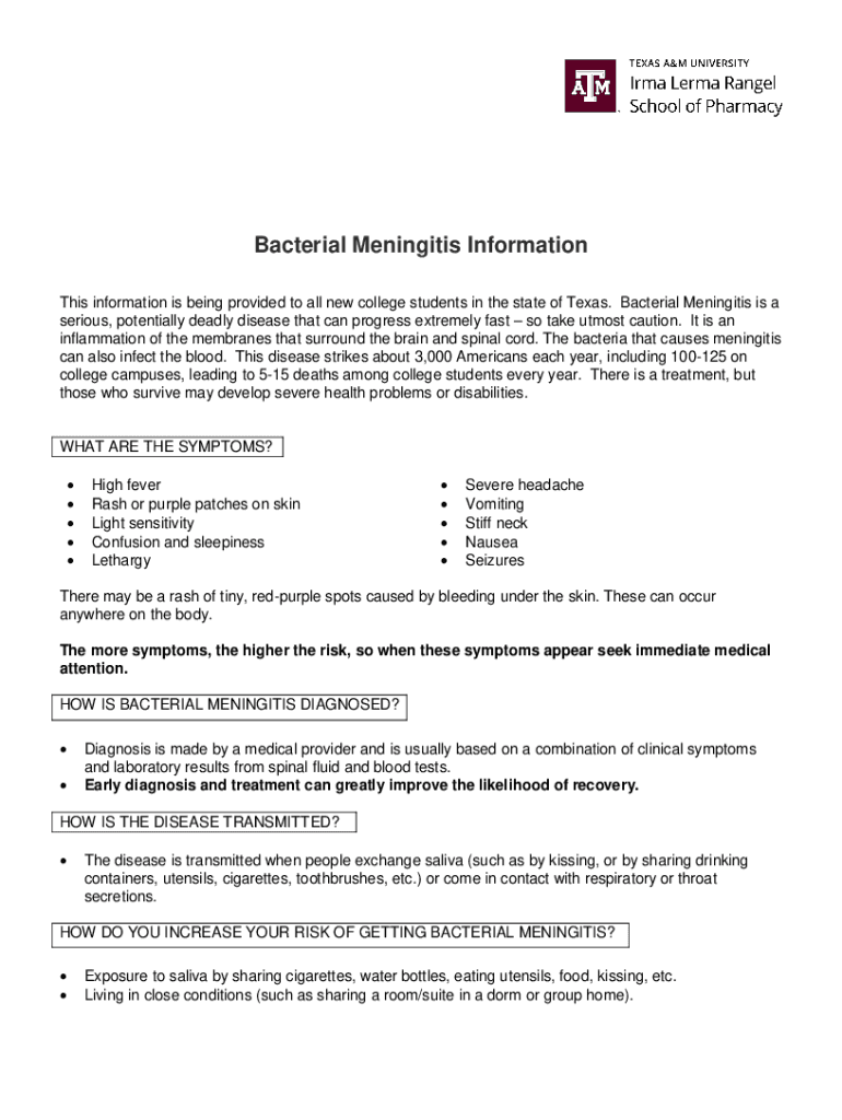 Bacterial Meningitis Information This information is being provided to all new college students in the state of Texas. Bacterial Meningitis is a serious, potentially deadly disease that can progress