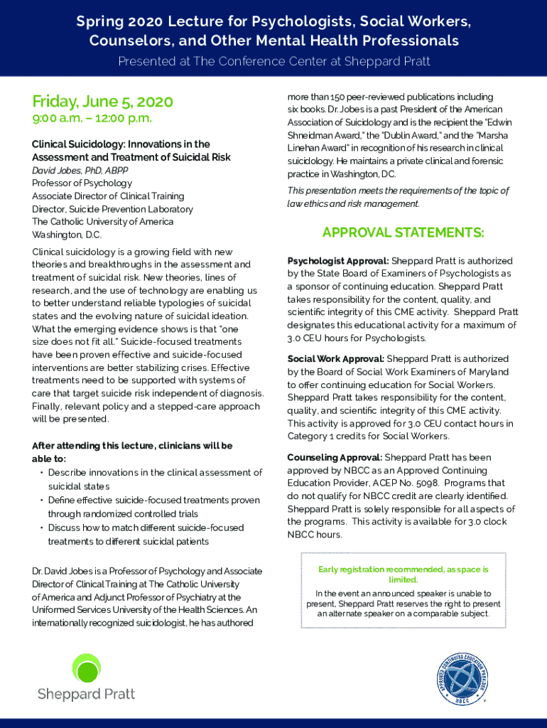 Spring 2020 Lecture for Psychologists, Social Workers, Counselors, and Other Mental Health Professionals Presented at The Conference Center at Sheppard Pratt Friday, June 5, 2020 9:00 a.m. 12:00 p.m.