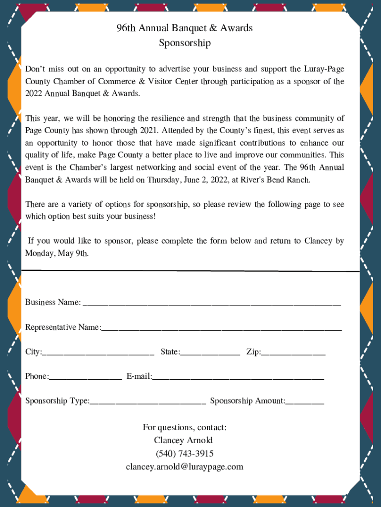 96th Annual Banquet & Awards Sponsorship Don't miss out on an opportunity to advertise your business and support the Rampage County Chamber of Commerce & Visitor Center through participation as a