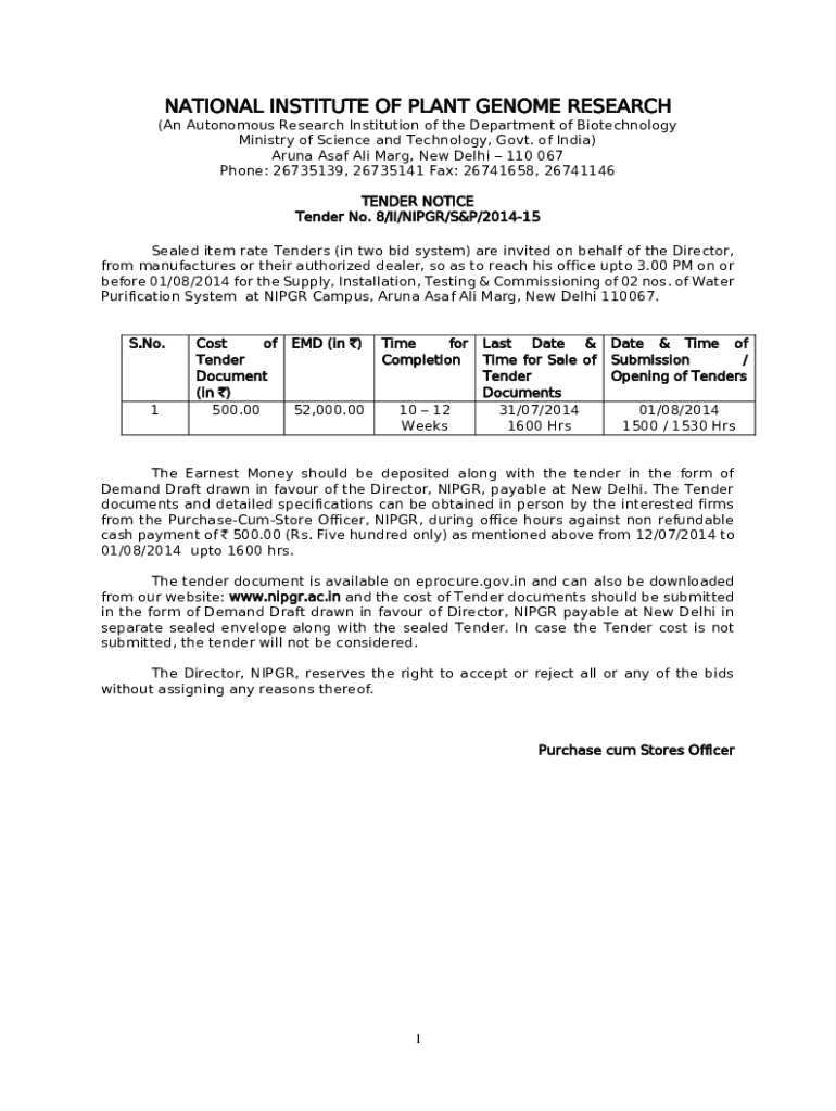 NATIONAL INSTITUTE OF PLANT GENOME RESEARCH (An Autonomous Research Institution of the Department of Biotechnology Ministry of Science and Technology, Govt. of India) Arena USAF Ali Mary, New Delhi