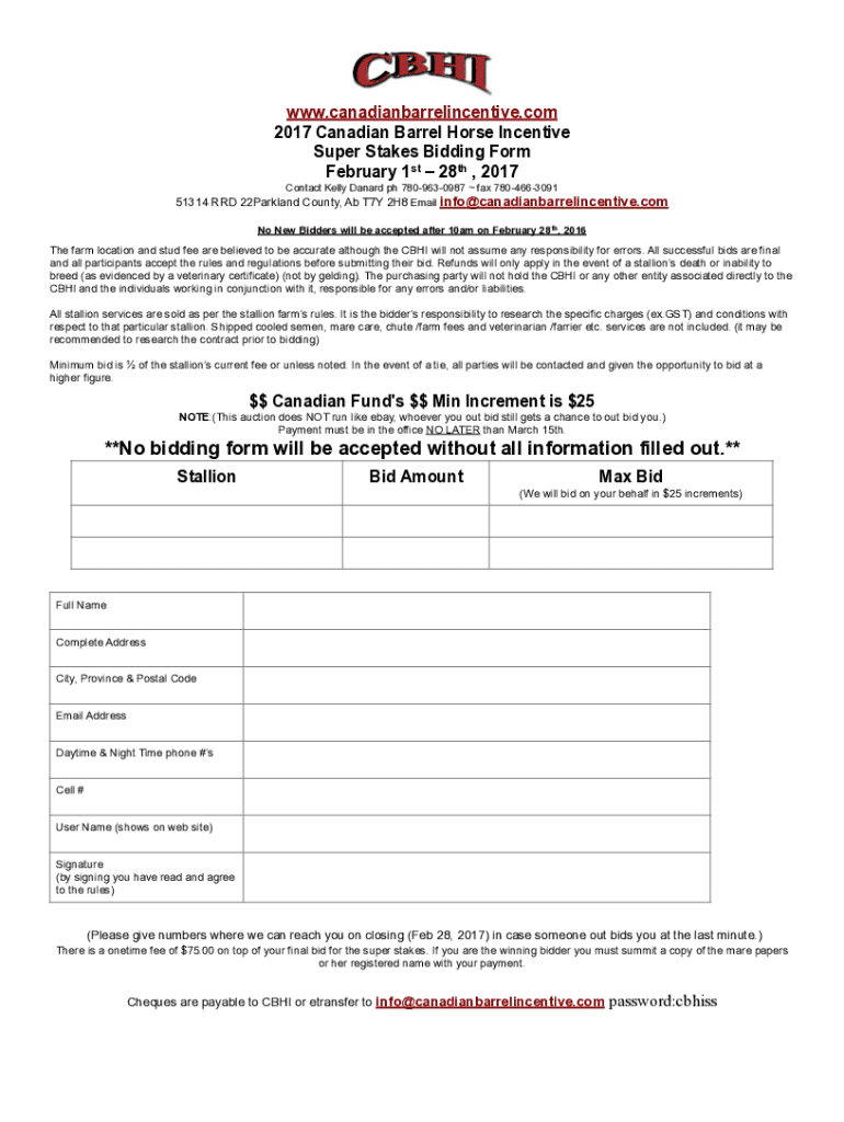 ! www.canadianbarrelincentive.com 2017 Canadian Barrel Horse Incentive Super Stakes Bidding Form February 1st 28th, 2017 Contact Kelly Canard pH 7809630987 fax 780466309151314 RED 22Parkland County,