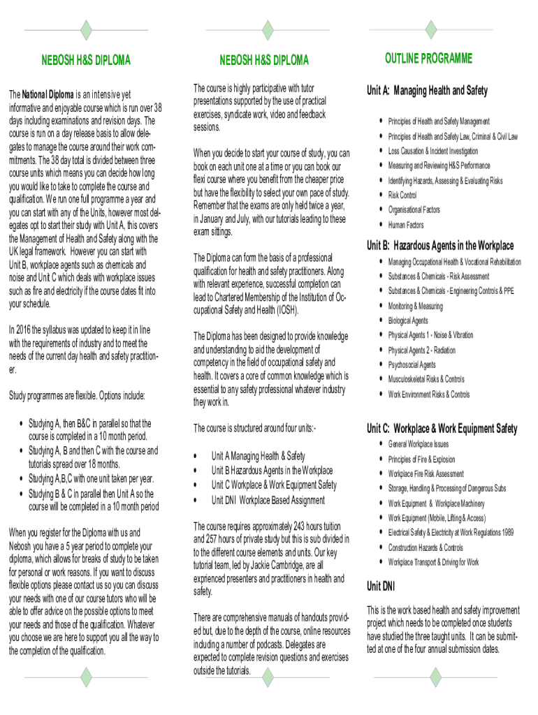 BOSH H&S DIPLOMA The National Diploma is an intensive yet informative and enjoyable course which is run over 38 days including examinations and revision days. The course is run on a day release basis