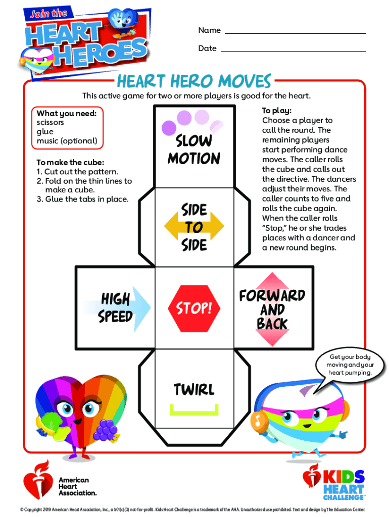 Join the Name ___ Date ___Heart Hero Moves This active game for two or more players is good for the heart. What you need: scissors glue music (optional) To make the cube: 1. Cut out the pattern. 2.