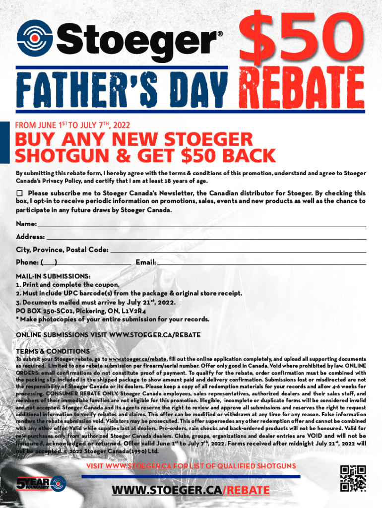 Rebate for Stoeger Canada is a promotional offer where customers can receive a partial refund on their purchase of Stoeger products.