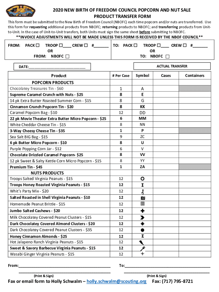 2020 NEW BIRTH OF FREEDOM COUNCIL POPCORN AND Not SALE PRODUCT TRANSFER From This form must be submitted to the New Birth of Freedom Council (NBFC) each time popcorn and/or nuts are transferred. Use