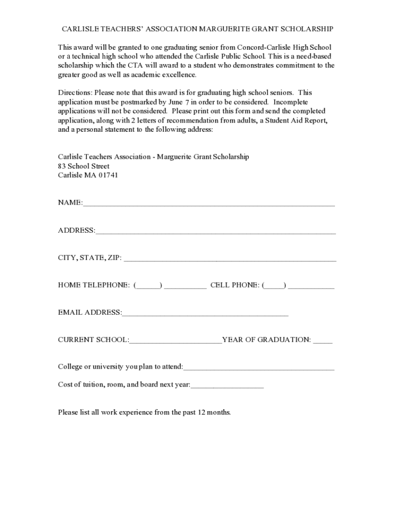 CARLISLE TEACHERS ASSOCIATION MARGUERITE GRANT SCHOLARSHIP This award will be granted to one graduating senior from ConcordCarlisle High School or a technical high school who attended the Carlisle