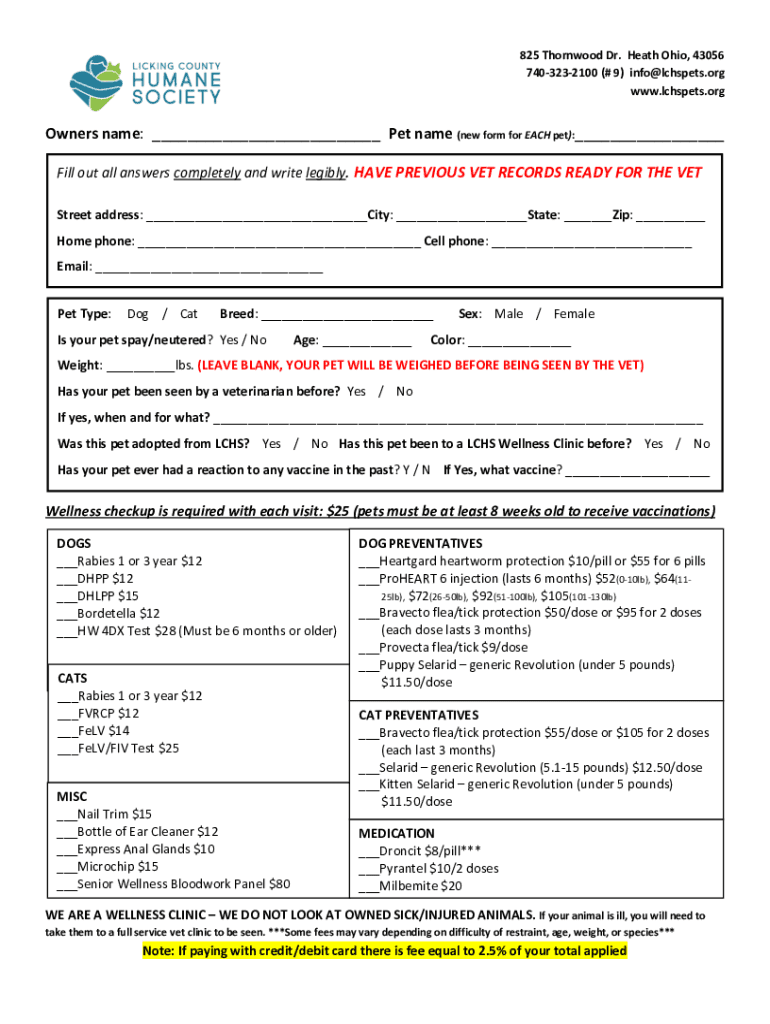 825 Thorn wood Dr. Heath Ohio, 43056 7403232100 (# 9) info@lchspets.org www.lchspets.orgOwners name: ___ Pet name (new form for EACH pet):___ Fill out all answers completely and write legibly. HAVE