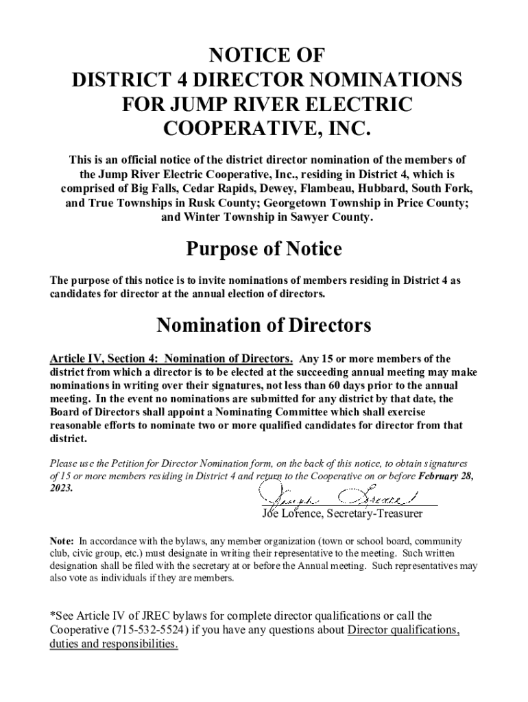 Get the free Notice of District 4 Director Nominations for Jump River ...