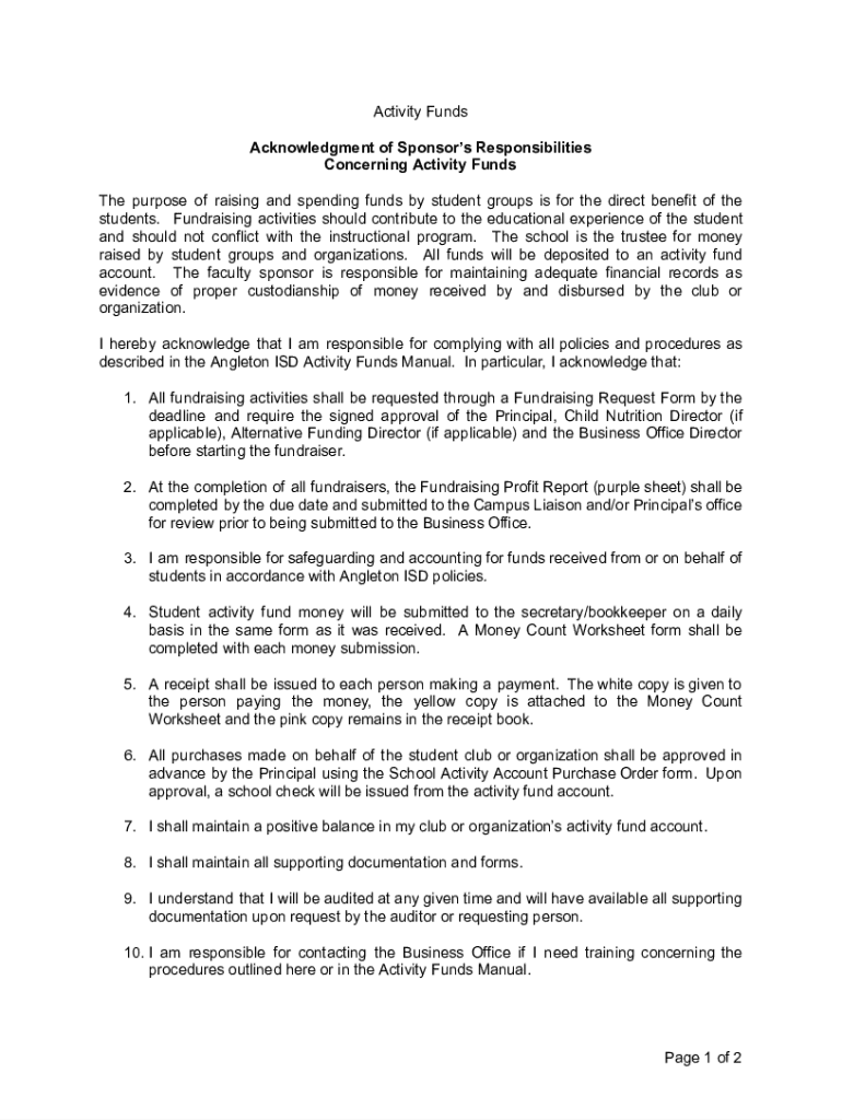 ActivityFunds AcknowledgmentofSponsorsResponsibilities ConcerningActivityFunds The purpose of raising and spending funds by student groups is for the direct benefit of the Students. Fundraising activities