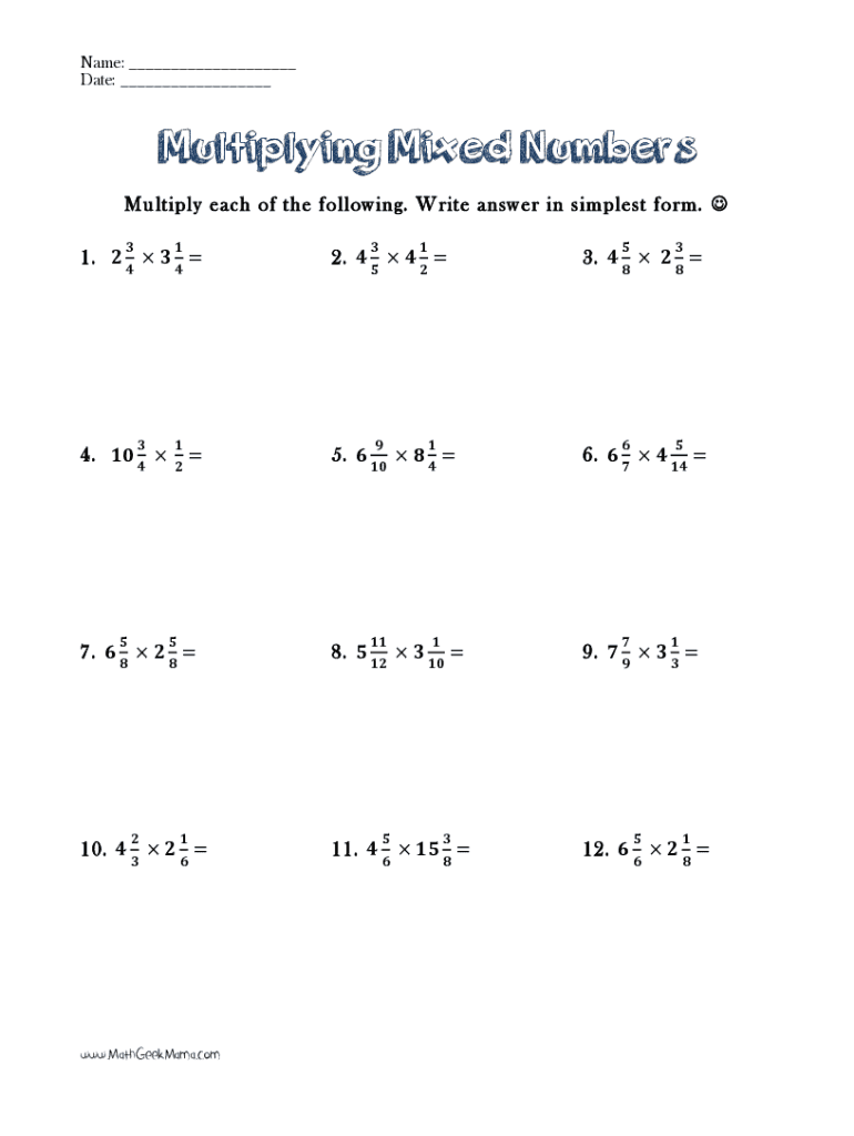 Name: ___ Date: ___Multiplying Mixed Numbers Multiply each of the following. Write answer in the simplest form. J 2. 5. 1. 4. 7. 8. 11. 10. WWW