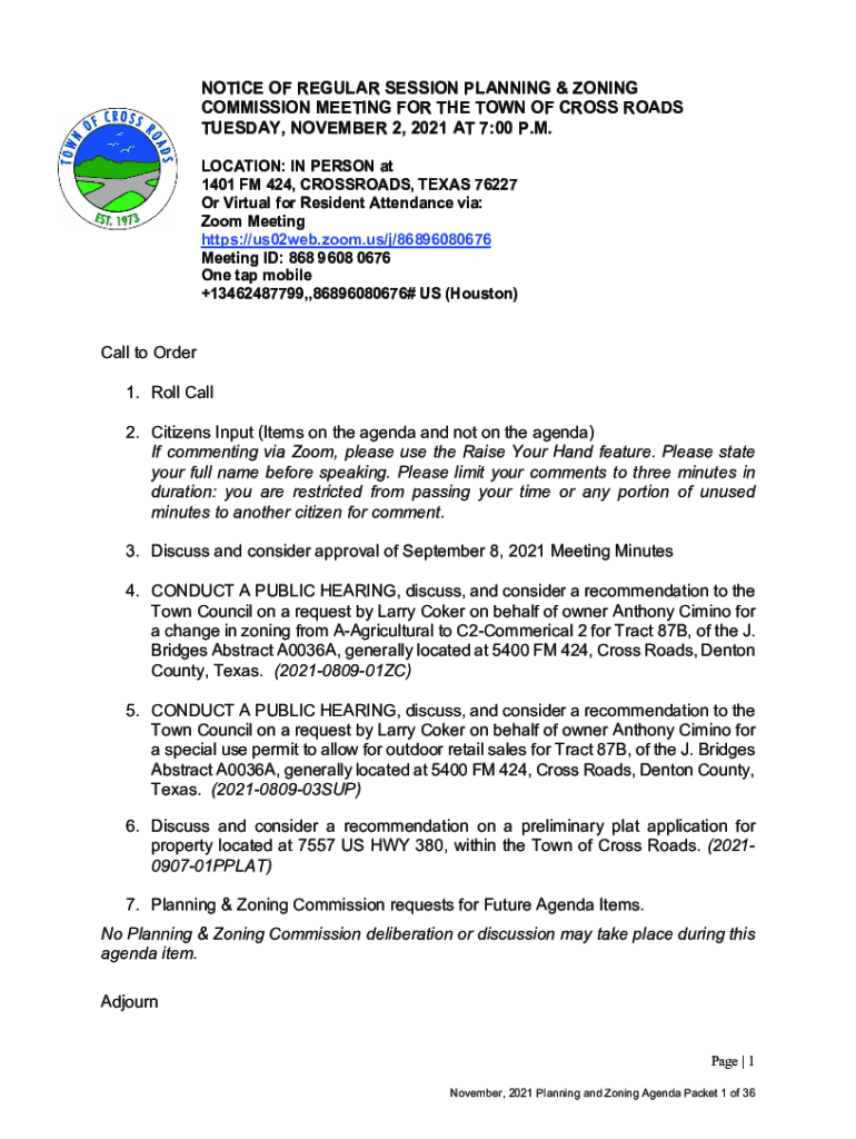 NOTICE OF REGULAR SESSION PLANNING & ZONING COMMISSION MEETING FOR THE TOWN OF CROSS ROADS TUESDAY, NOVEMBER 2, 2021, AT 7:00 P.M. LOCATION: IN PERSON at 1401 FM 424, CROSSROADS, TEXAS 76227 Or Virtual