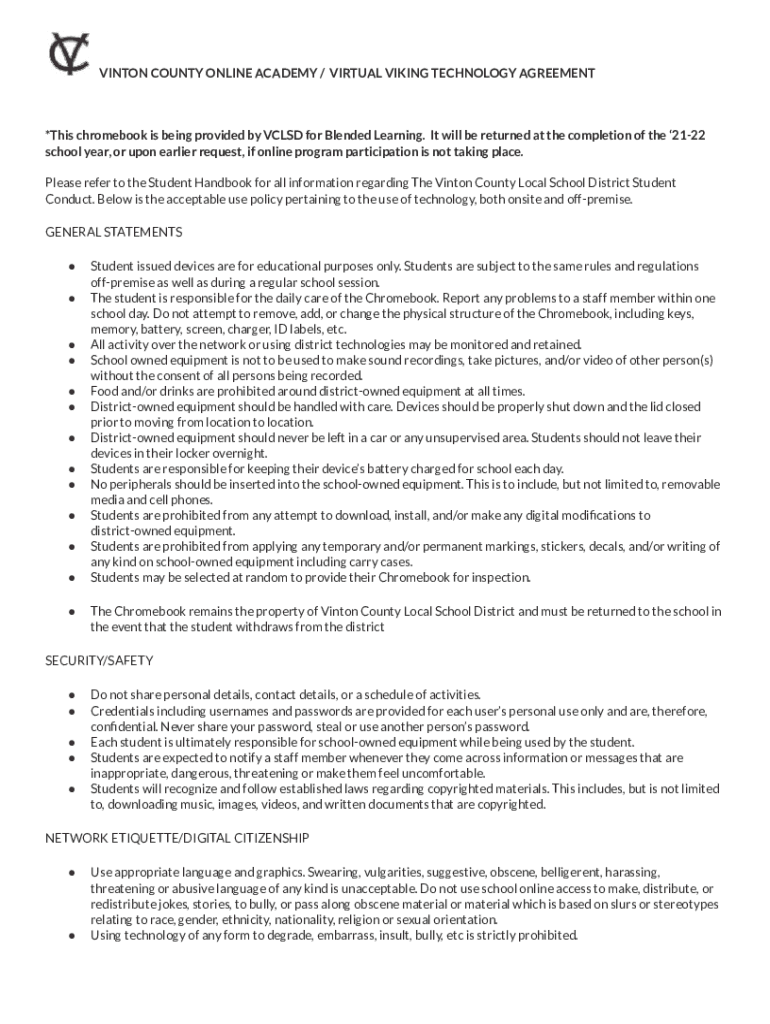 HINTON COUNTY ONLINE ACADEMY / VIRTUAL VIKING TECHNOLOGY AGREEMENT×This Chromebook is being provided by VC LSD for Blended Learning. It will be returned to the completion of the 2122 school year,