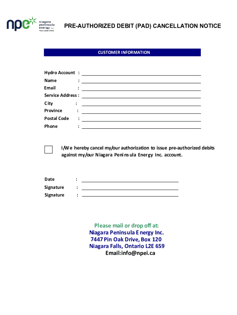 PREAUTHORIZED DEBIT (PAD) CANCELLATION NOTICECUSTOMER INFORMATIONHydro Account : Name : Email : Service Address :City Province: :Postal Code:Phone:I/W e hereby cancel my/our authorization to issue