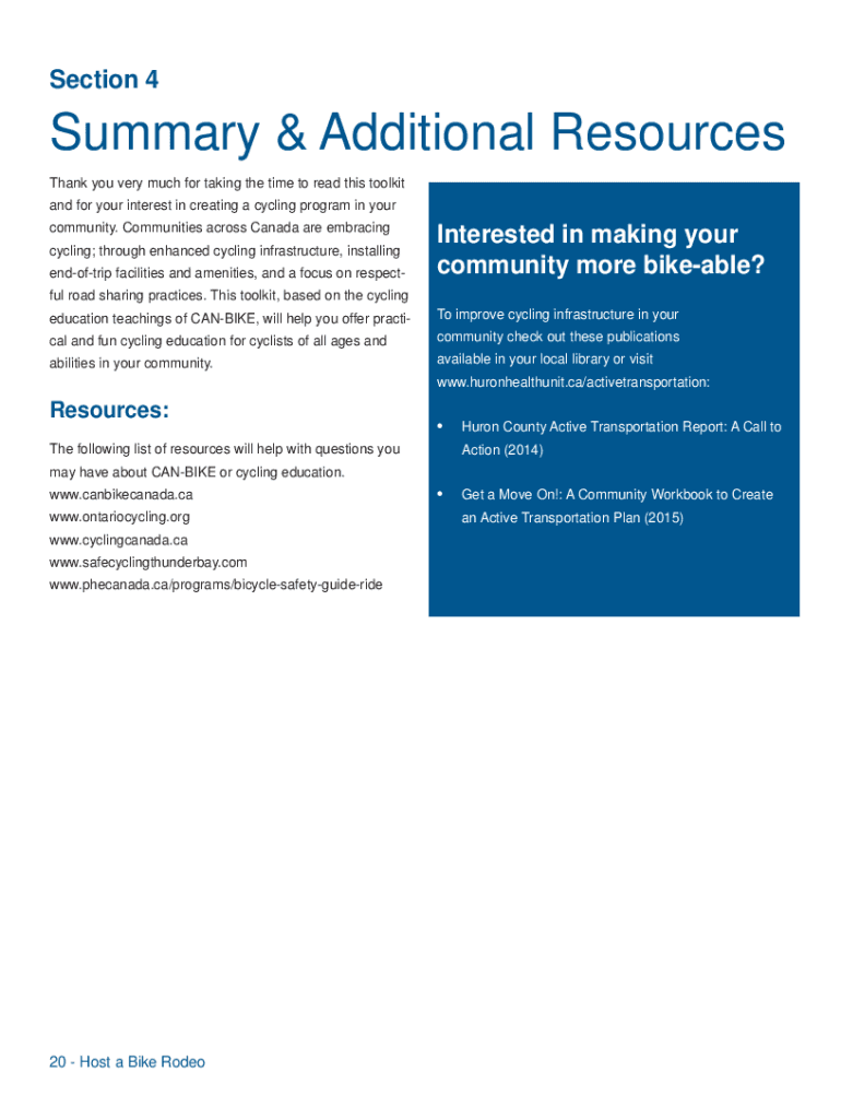 Section 4Summary & Additional Resources Thank you very much for taking the time to read this toolkit and for your interest in creating a cycling program in your community. Communities across Canada