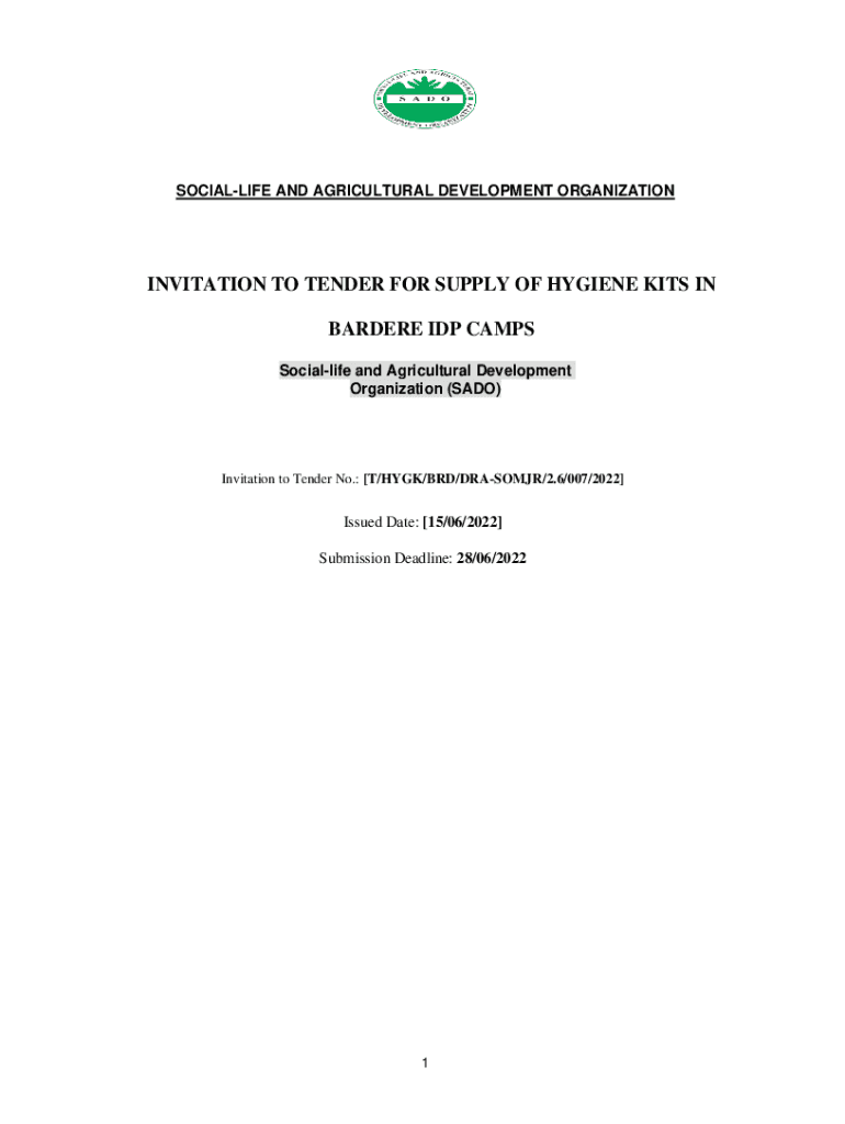 SOCIALITE AND AGRICULTURAL DEVELOPMENT ORGANIZATIONINVITATION TO TENDER FOR SUPPLY OF HYGIENE KITS IN BORDER IDP CAMPS Social life and Agricultural Development Organization (SAD)Invitation to Tender
